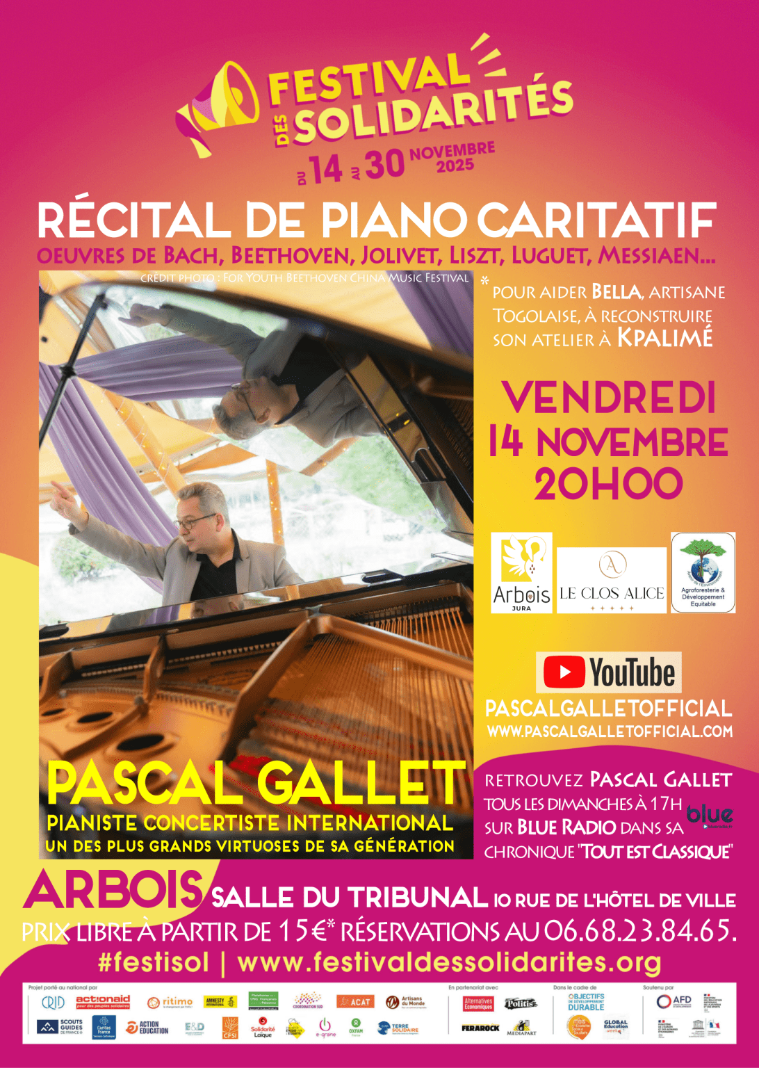 Dans le cadre du festival des Solidarités et organisé par l’association de solidarité internationale ADE France (Salins les Bains) qui soutient les petits producteurs et transformateurs de la filière cafécacao au Togo. Le collectif FestiSol d’Arbois vous propose un concert du pianiste-concertiste international Pascal Gallet à l’occasion de la tournée de ses 40 ans de carrière !