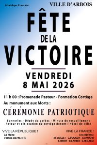La Ville d’Arbois vous invite à prendre part à la cérémonie patriotique du vendredi 8 mai 2025, à l’occasion de la Fête de la Victoire,